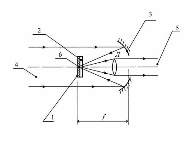 Изображения из патента РФ № 2509323 на оптический пассивный затвор: 1 — металлическая плавящаяся и испаряющаяся под действием излучения зеркальная плёнка, 2 — прозрачная подложка, 3 — параболическое зеркало, 4 и 5 — входная и выходная апертуры оптического устройства с затвором, 6 — область в плёнке 1, подвергаемая воздействию лазерного нагревания, g — фокусное расстояние параболического зеркала, Л — объектив