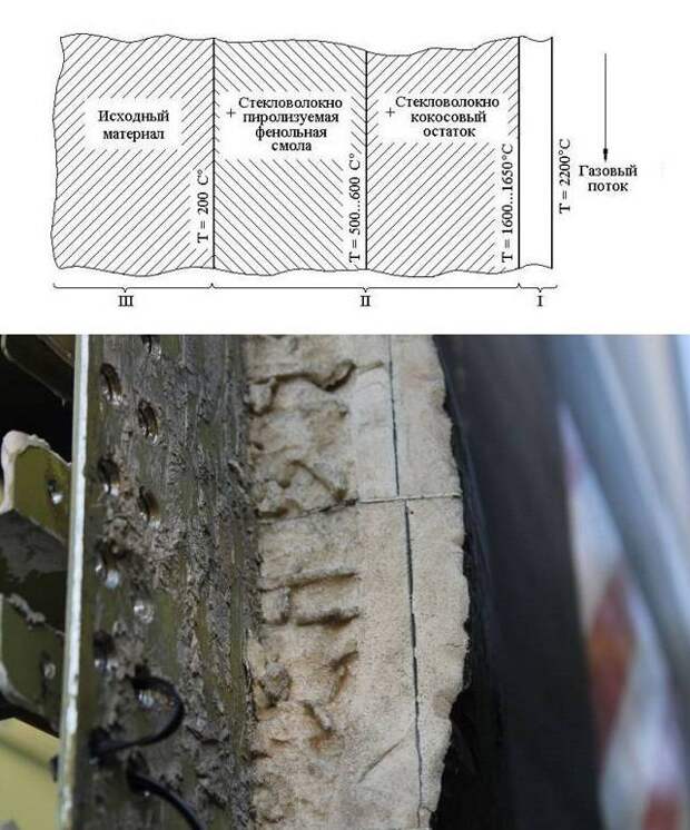 Схема абляционной защиты и абляционная защита космического корабля «Буран» в разрезе