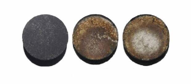 Керамическое покрытие Zr0.8Ti0.2C0.74B0.26, разработанное учёными из Института Ройса при Университете Манчестера (Великобритания) и Центрального южного университета (Китай) – слева материал до проведения испытаний, в центре и справа – после двухминутных испытаний при температуре 2000°C и 2500°C, в центре правого образца находится белый участок, где температура достигала 3000°C